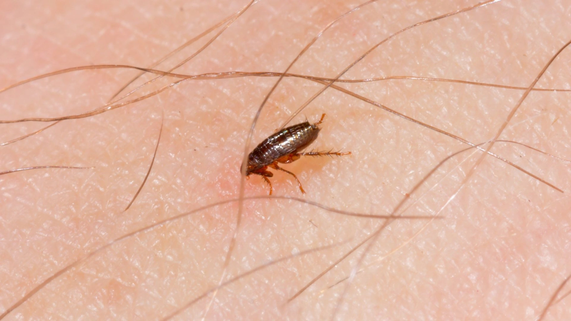 Fleas are tiny, wingless insects with flat, hard bodies. They are reddish-brown and have six legs; their hind legs are larger and stronger than the others, and allow them to jump onto their hosts. Fleas feed on the blood of their animal hosts.